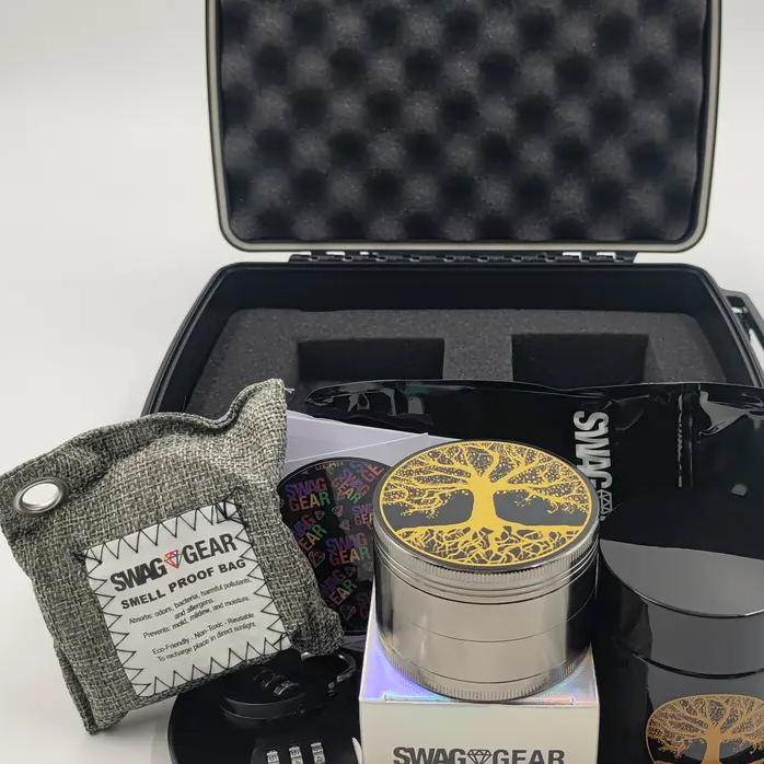 This set includes: cigarette case, cigarette grinder, glass bottle, two locks, charcoal bag, tray